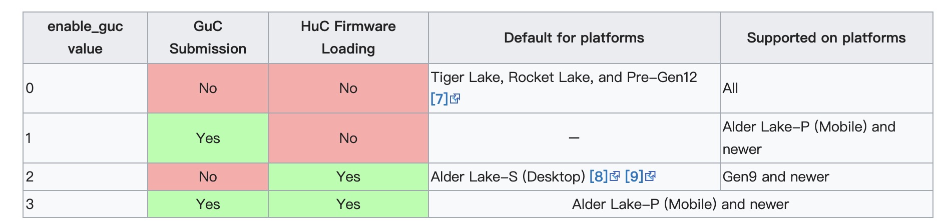 如果非N5105可参照下图确认guc支持情况,3代表同时开始GuC和HuC。更多可参照下文Enable GuC链接。