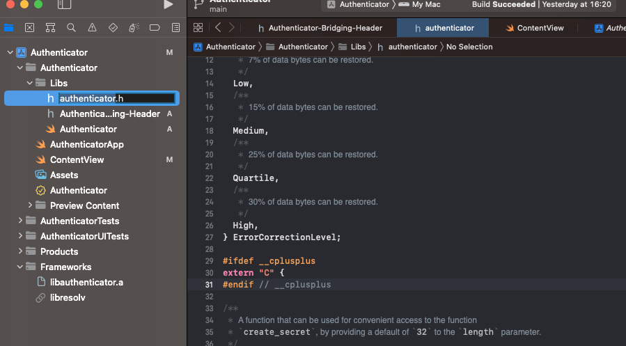 Objective-C Bridging Header增加 $(PROJECT_DIR)/Authenticator/Authenticator-Bridging-Header.h