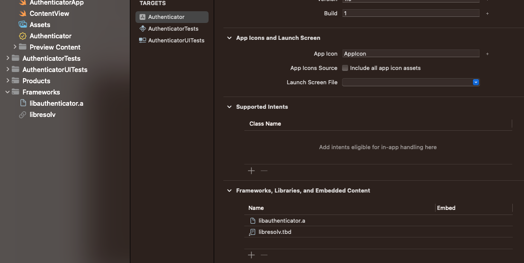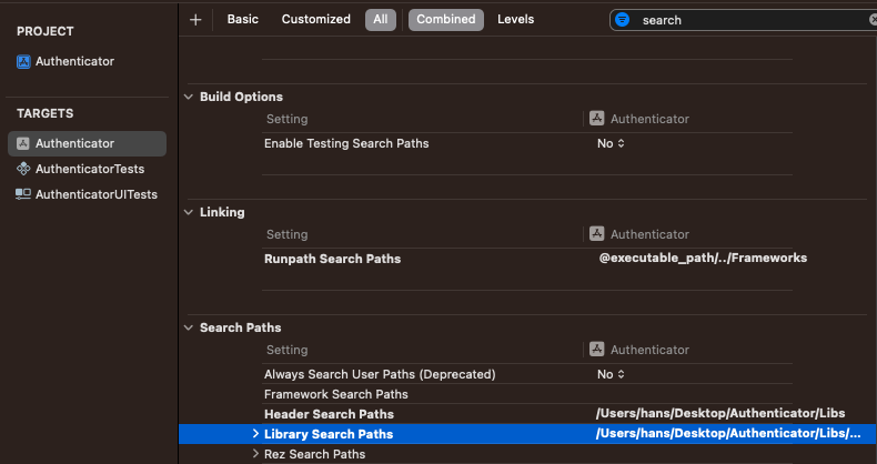 Search Paths -> Header Search Paths 增加 $(PROJECT_DIR)/AuthenticatorSearch Paths -> Library Search Paths 增加 $(PROJECT_DIR)/Authenticator