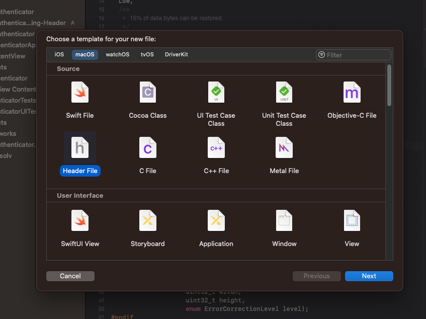 xcode File -> New -> File..., 选择Header File并命名为 Authenticator-Bridging-Header.h。